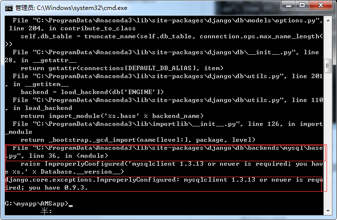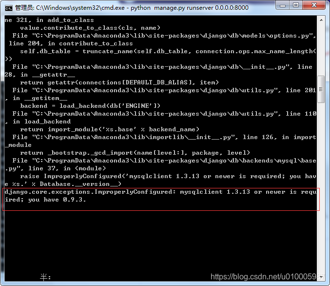 报错:MySQLclient 1.3.13 or nerer is required ;you have 0.9.3. (意思好像是版本错误)