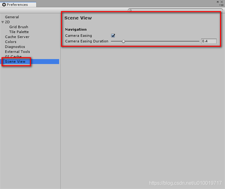 可以在场景视图中设置是否使用Easing进行相机操作