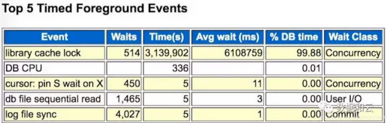 出现这类问题非常典型的AWR报告呈现如下,首先在 TOP 5 中,你可能看到显著的 Library Cache Lock 的等待 ,如果用sql查等待时间,则username列为空,以下范例来自11.2.0.3.0版本的真实情况:
