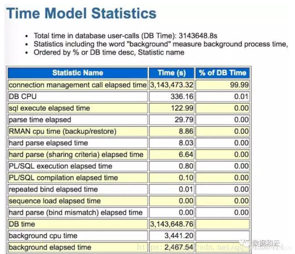 在这类情况下,时间模型 - Time Model 中会显示如下指标,其中 connection management call elapsed time 占据了主要的DB Time,这个等待直接表明是在建立数据库连接时产生的: