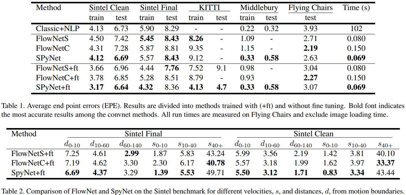 (2) 提出一个新的模型SpyNet,比FlowNet更快,参数量少96%;