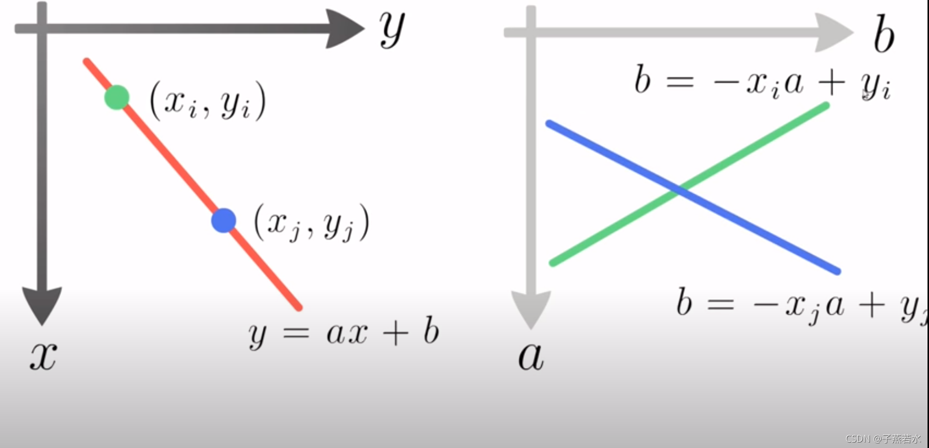 ()可以确定一条蓝色的线,绿线和蓝线相交的点就是左边确定红线的参数a和b.此时xy空间里红线上的其他点,变换到ab空间必过蓝绿线相交点.