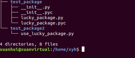 我的是创建在/home/xyh/test_package,下边是我的目录结构。要在另一个不相关的文件夹下的python应用中引用到我们自定义的包。就是在/home/xyh/test_package2/use_lucky_package.py中导入lucky_package.py这个包,测试直接