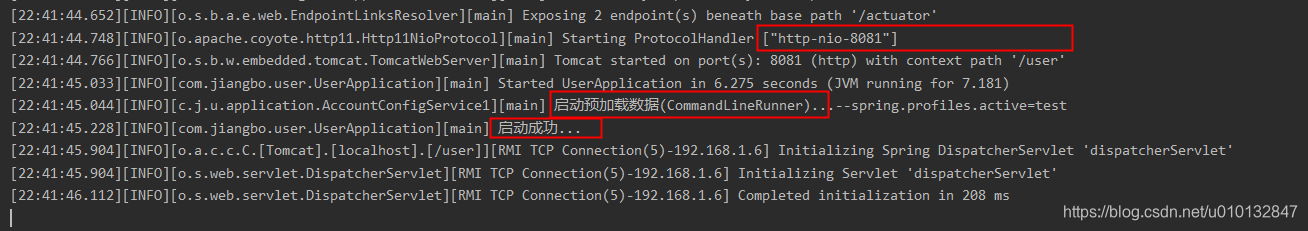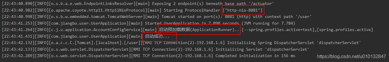 2.1.3、启动日志关键信息截图(注意点:预加载数据在容器启动之后,自定义的日志打印前启动执行。)