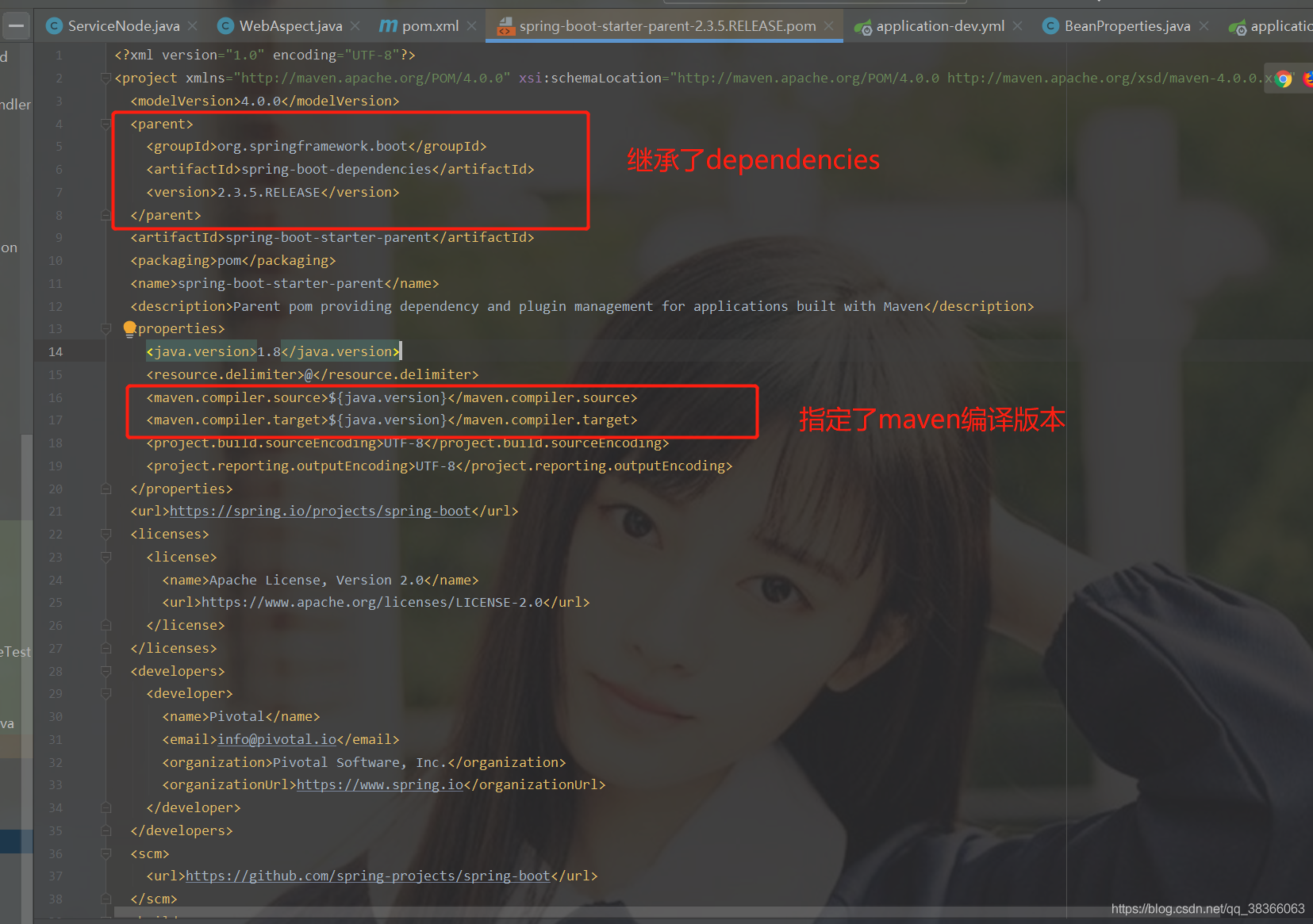 继承spring-boot-starter-parent其实也算是继承自spring-boot-dependencies,我们点开spring-boot-starter-parent,可以看到parent其实也是继承dependencies,parent里面就增加了一些插件,然后指定了maven编译版本: