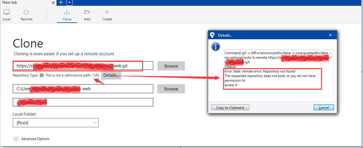 先介绍下背景,新加入一个项目, git 账号也需要变换。在 source tree上克隆代码到本地时总是报下面的错误。git 仓库地址不能正确识别,在本地git bash可以克隆成功,并且修改了所有的有可能的账户为新账户。