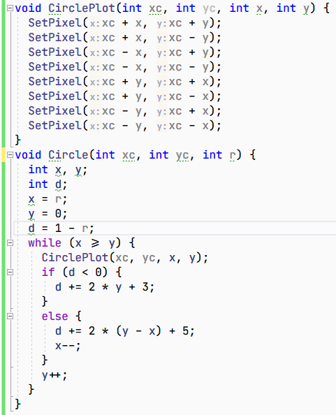 - 四种情况,考虑斜率正的时候 x++ y++,表达式 d 两种,斜率负的时候 x++,y-- 表达式同样两种。不过至于 y 是+还是-其实可以算出来。为了统一,分为 x++,y?? 和 x??,y++ 的情况比较好写(表达式基本对称)。