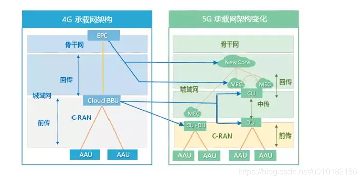 相比于4G来说,5G的接入网(就理解为基站系统吧)发生了翻天覆地的变化,进而带着承载网(基站和基站之间、基站和核心网之间的连接系统)也发生了巨变。