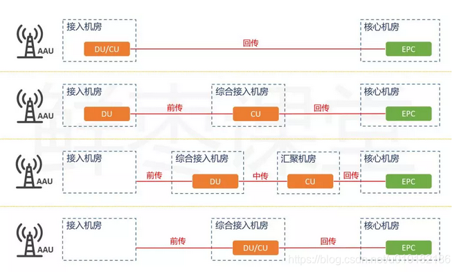 依据5G提出的标准,CU、DU、AAU可以采取分离或合设的方式,所以,会出现多种网络部署形态: