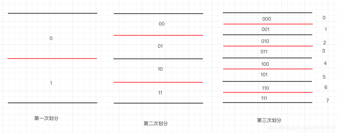 但是我们划分格子的时候格子一开始是不固定的,所以也不好这样编号,我们用二进制编号,而四周的计算方式是不变的,二进制编号如图,这里展示y的划分,x的划分同理,最后就能和上面一样,只不过是二进制的,方便在递归划分的时候分格子
