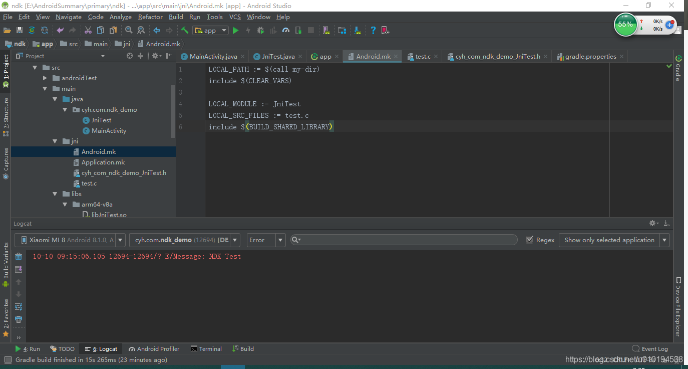至此,.h文件和c文件均已完成,接下来还需要在这个jni目录下增加两个文件,Android.mk和Application.mk。