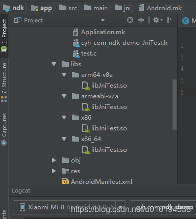 如图,在main/libs目录下生成了多个so文件,名字为lib+我们指定的库名,同时还生成了obj文件夹。
