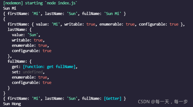 console.log(s1); // { firstName: 'Mi', lastName: 'Sun', fullName: 'Sun Mi' }// Object.getOwnPropertyDescriptors()配合Object.defineProperties()实现对象的拷贝