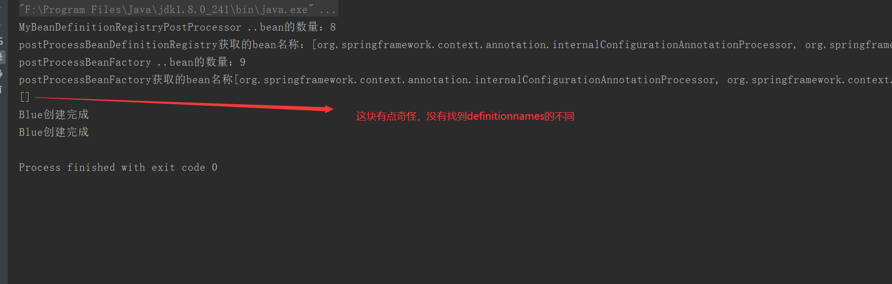 // RootBeanDefinition beanDefinition = new RootBeanDefinition(Blue.class);//2、使用BeanDefinitionBuilder构建一个beanDefinitionAbstractBeanDefinition beanDefinition = BeanDefinitionBuilder.rootBeanDefinition(Blue.class).getBeanDefinition();registry.registerBeanDefinition("hello",beanDefinition);beanDefinitionNames1 = registry.getBeanDefinitionNames();System.out.println("postProcessBeanDefinitionRegistry获取的bean名称:"+Arrays.asList(beanDefinitionNames1));}public void postProcessBeanFactory(ConfigurableListableBeanFactory beanFactory) throws BeansException {System.out.println("postProcessBeanFactory ..bean的数量:" + beanFactory.getBeanDefinitionCount());beanDefinitionNames2 = beanFactory.getBeanDefinitionNames();System.out.println("postProcessBeanFactory获取的bean名称"+ Arrays.asList(beanDefinitionNames2));System.out.println(getDiffArrElem(beanDefinitionNames1,beanDefinitionNames2));