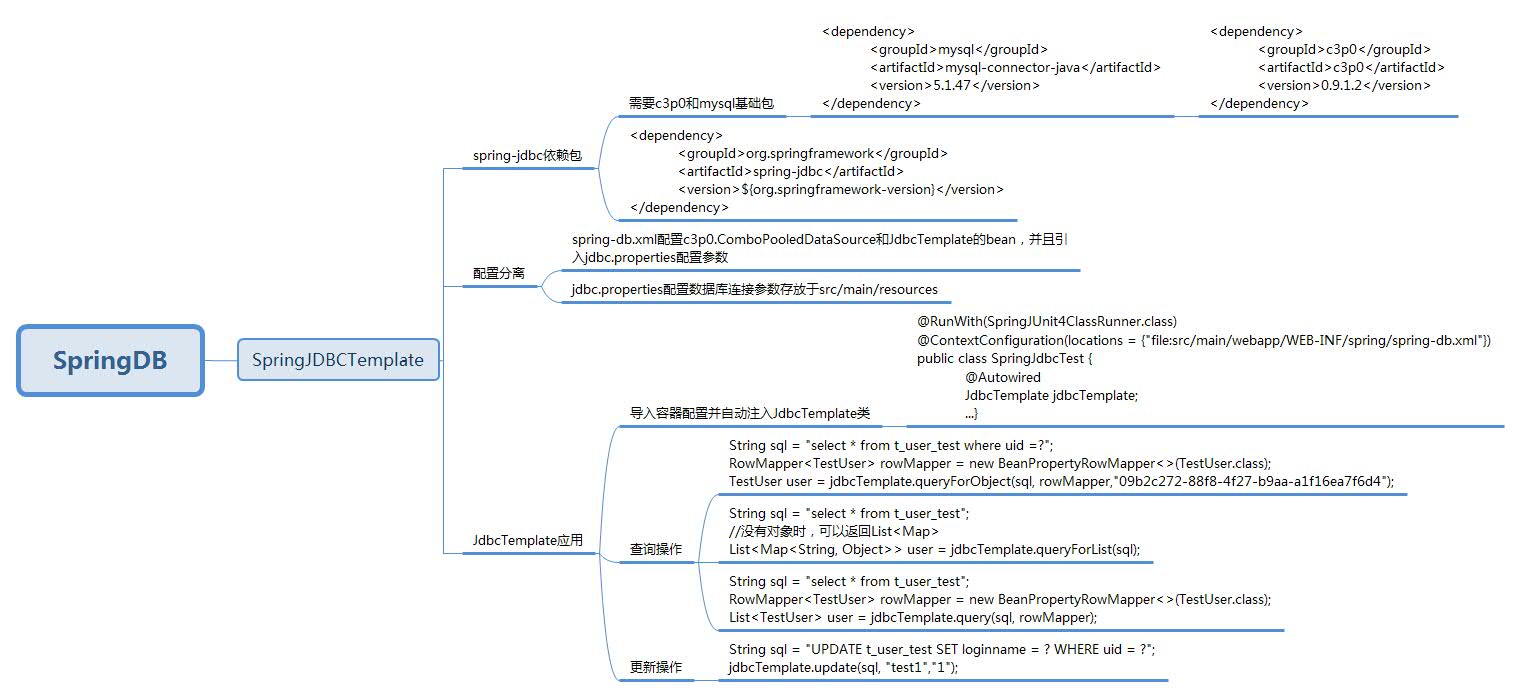 可以将连接参数与ioc配置分离,例如spring-db.xml文件配置c3p0.ComboPooledDataSource和JdbcTemplate的bean,并且引入jdbc.properties文件配置的参数。jdbc.properties文件配置数据库连接参数,可以存放于src/main/resources,这样主程序和test程序都可以引用。
