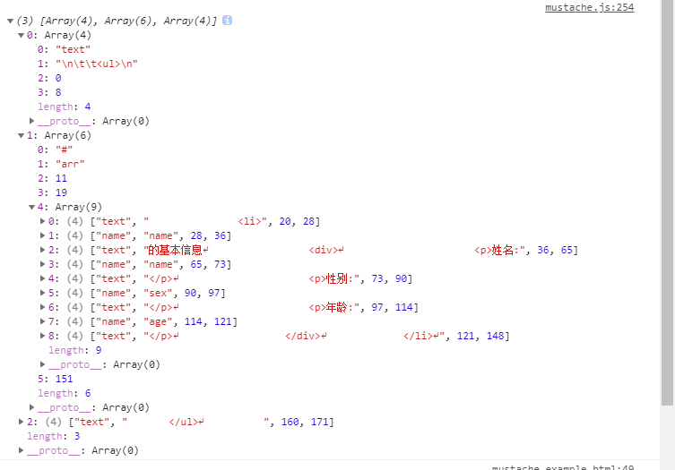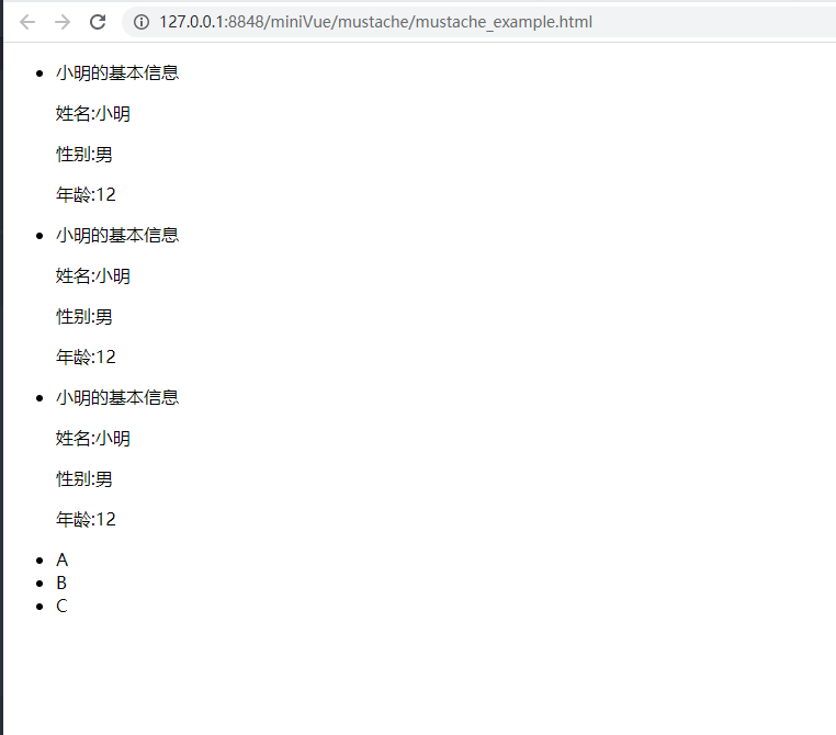 <html><head><meta charset="utf-8"><title></title><script src="https://unpkg.com/mustache@latest"></script>//引用mustache项目</head><body><div id="app"></div><div id="app1"></div></body><script type="text/javascript">console.log("here");var templateStr = `<ul>{{#arr}}<li>{{name}}的基本信息<div><p>姓名:{{name}}</p><p>性别:{{sex}}</p><p>年龄:{{age}}</p></div></li>{{/arr}}</ul>`;var data = {arr: [{"name": "小明","age": 12,"sex": "男"}, {"name": "小明","age": 12,"sex": "男"}, {"name": "小明","age": 12,"sex": "男"}]};var domStr = Mustache.render(templateStr, data);console.log(domStr);var container = document.getElementById('app');container.innerHTML=domStr;var templateStr1 = ` <ul>{{#arr}}<li>{{.}}</li>{{/arr}}</ul>`;var data1 ={arr:['A','B','C']}var domstr1 = Mustache.render(templateStr1, data1);console.log(domstr1);container.innerHTML +=domstr1;</script>
