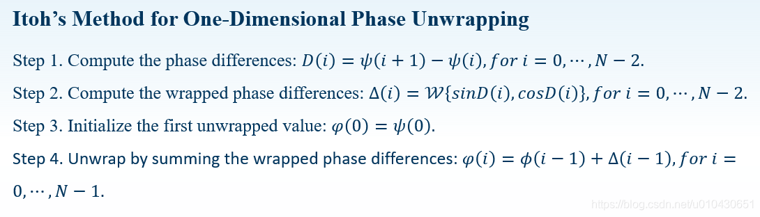 早在1982年Itoh对一维相位解包裹问题进行了总结,如下图的具体步骤。要注意的是,步骤2里的指截断运算,反正切就是一种截断运算。不过这一步里,为了好理解和方便转成代码,我认为更合适的是MOD 2pi运算。