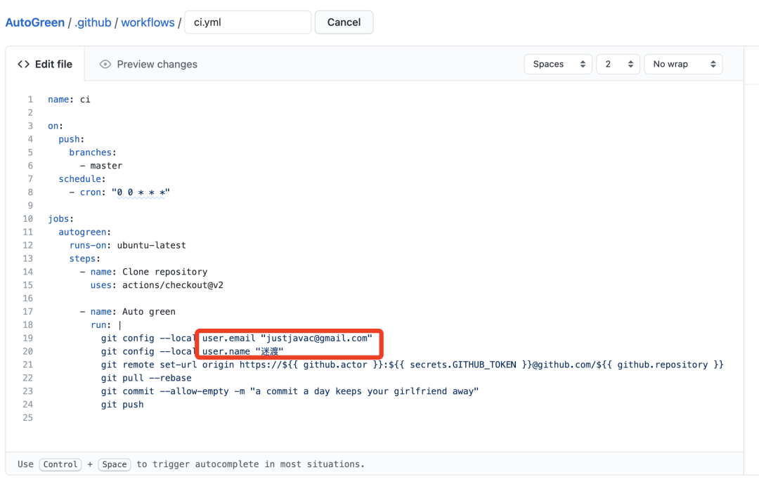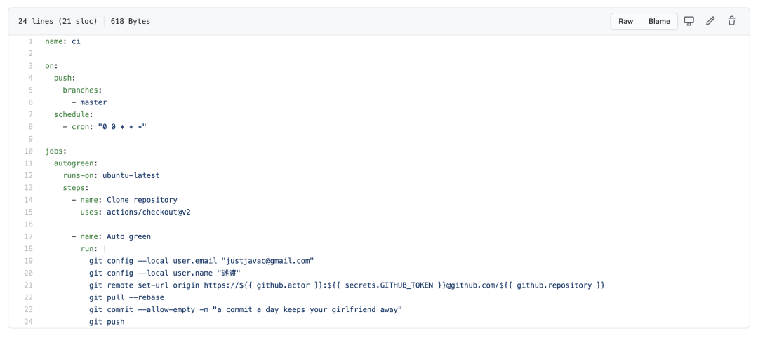 看看这个文件,意思就是每天执行一下下面的这几行代码,比如 git 的 config、commit、push 等,就相当于模拟了一次提交。