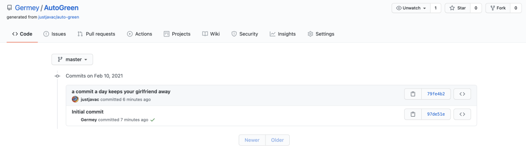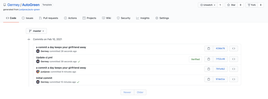 执行完了你会发现这个仓库多了一次 commit,是来自 justjavac 的一次 commit: