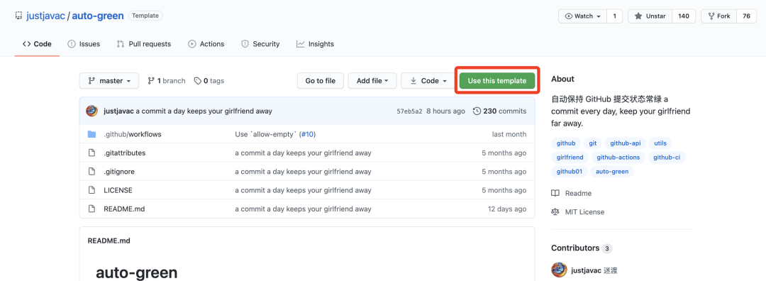 这里介绍一个 GitHub 的库,地址为:https://github.com/justjavac/auto-green,借助它,咔咔几步就能搞定了。