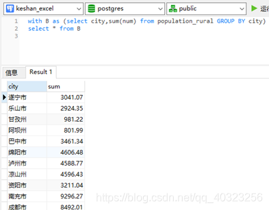 B as (select city,sum(num) from population_rural GROUP BY city), -