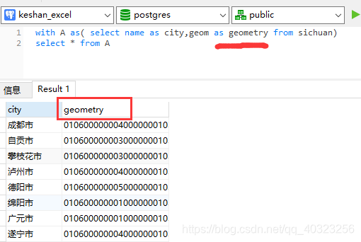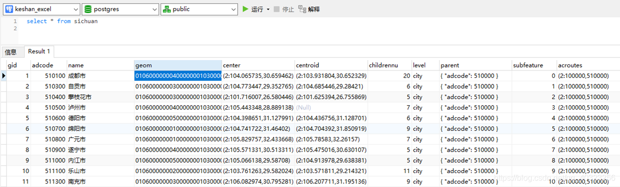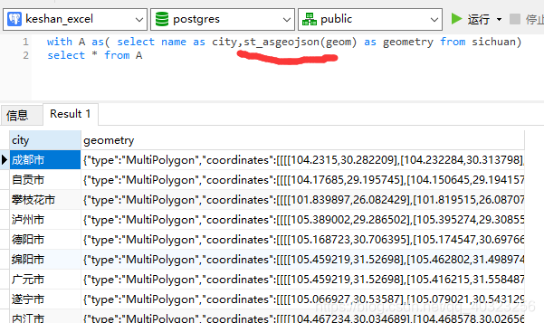 接着想把geometry字段中的数据改为json格式,用函数:st_asgeojson()可以实现: