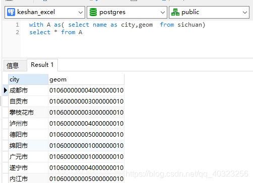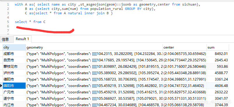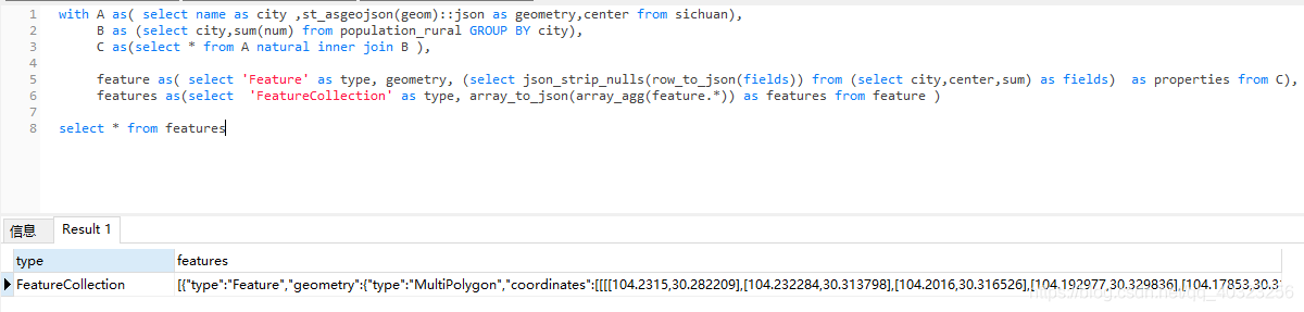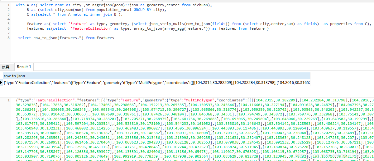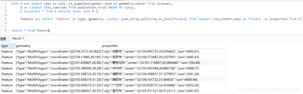 with A as( select name as city ,st_asgeojson(geom)::json as geometry,center from sichuan), -