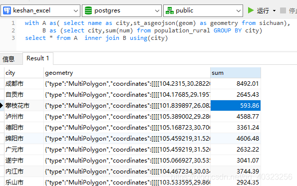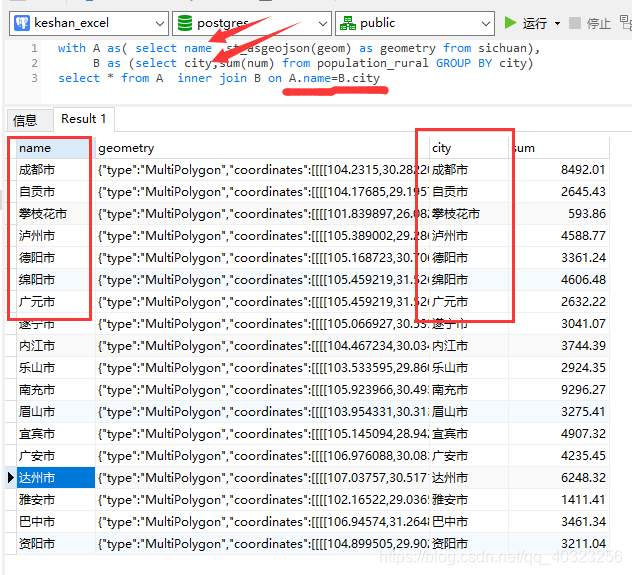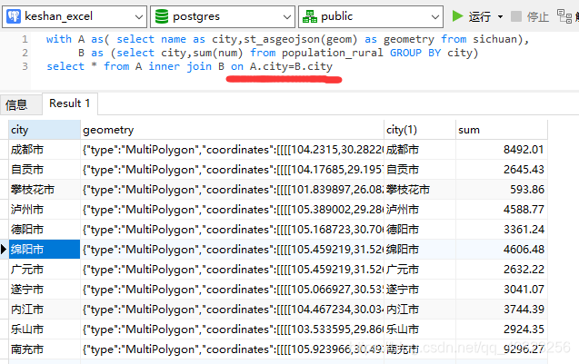 比如现在有两张表,一张population_rural表和一张sichuan表,population_rural表提供属性数据,sichuan表提供地理空间数据