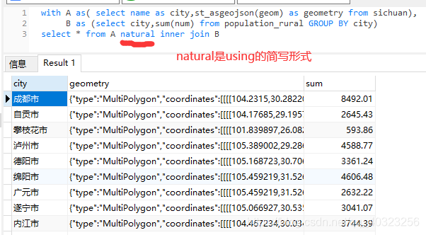 可以看到,使用USING(city),它会自动使用on A.city=B.city,而且结果只会保留一个city。
