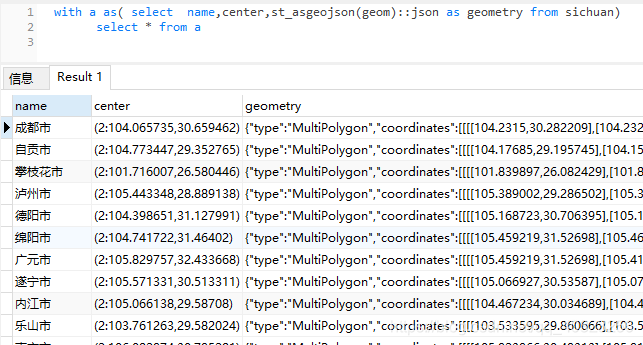 with a as( select name,center,st_asgeojson(geom)::json as geometry from sichuan) -