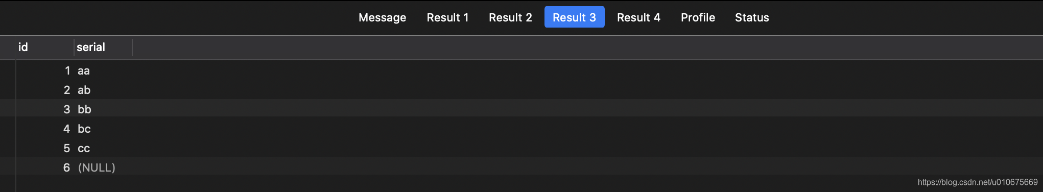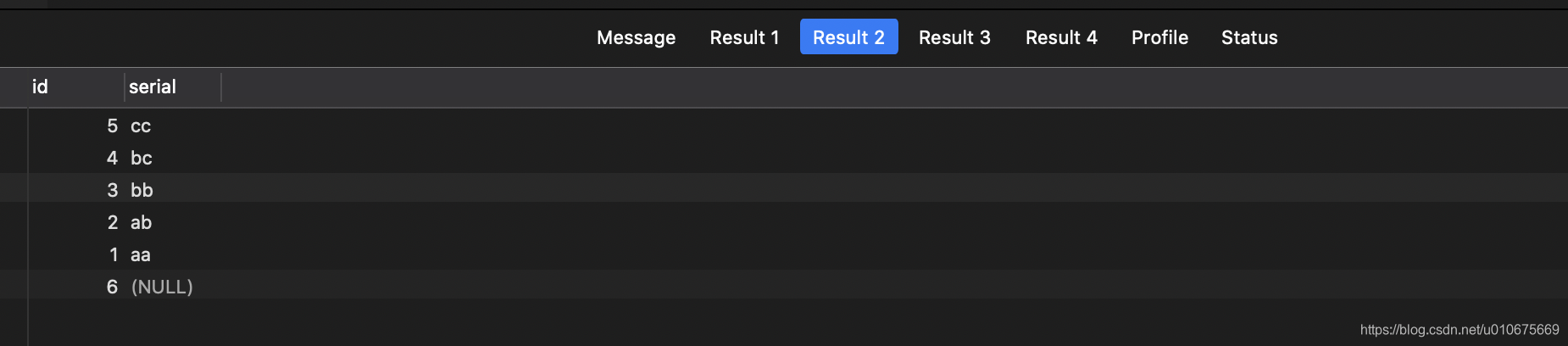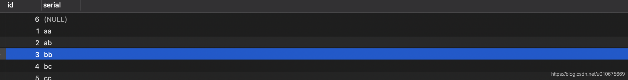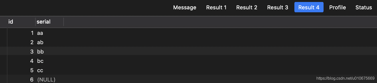 select * FROM payment ORDER BY serial ASC; -- null值最前面