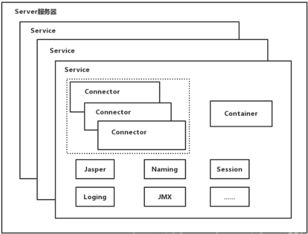 一个Tomcat中只有一个Server,一个Server可以包含多个Service,一个Service只有一个Container,但可以有多个Connector。(因为一个服务可以有多个连接,如同时提供http和https连接,也可以提供相同协议不同端口的连接)