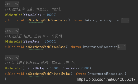 3.fixedDelay(单位毫秒),每次方法执行完毕后,休息固定时间后再次启动