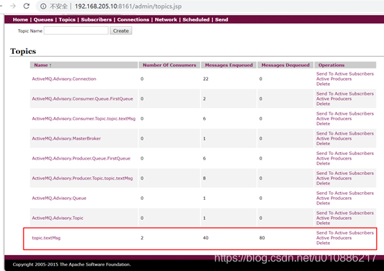 public class TopicMsgProducer {public void send() {//创建连接工厂ActiveMQConnectionFactory factory = new ActiveMQConnectionFactory("tcp://192.168.205.10:61616");Connection conn = null;try {//创建连接conn = factory.createConnection();conn.start();//创建会话Session session = conn.createSession(false,Session.AUTO_ACKNOWLEDGE);//创建地点Topic topic = session.createTopic("topic.textMsg");//创建生产者MessageProducer producer = session.createProducer(topic);producer.setDeliveryMode(DeliveryMode.PERSISTENT);producer.setTimeToLive(Message.DEFAULT_TIME_TO_LIVE);for(int i=0 ; i<10 ;i++) {TextMessage tmsg = session.createTextMessage();tmsg.setText("早上你好 "+i);producer.send(tmsg);System.out.println("发送的消息:"+tmsg.getText());}} catch (JMSException e) {e.printStackTrace();} finally {try {if (conn !=null )conn.close();} catch (Throwable ignore) {}}}public static void main(String[] args) {new TopicMsgProducer().send();}