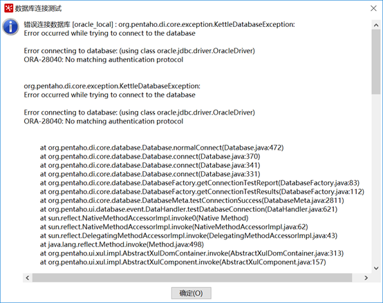 ORA-28040: No matching authentication protocolat org.pentaho.di.core.database.Database.normalConnect(Database.java:472)at org.pentaho.di.core.database.Database.connect(Database.java:370)at org.pentaho.di.core.database.Database.connect(Database.java:341)at org.pentaho.di.core.database.Database.connect(Database.java:331)at org.pentaho.di.core.database.DatabaseFactory.getConnectionTestReport(DatabaseFactory.java:83)at org.pentaho.di.core.database.DatabaseFactory.getConnectionTestResults(DatabaseFactory.java:112)at org.pentaho.di.core.database.DatabaseMeta.testConnectionSuccess(DatabaseMeta.java:2811)at org.pentaho.ui.database.event.DataHandler.testDatabaseConnection(DataHandler.java:621)at sun.reflect.NativeMethodAccessorImpl.invoke0(Native Method)at sun.reflect.NativeMethodAccessorImpl.invoke(NativeMethodAccessorImpl.java:62)at sun.reflect.DelegatingMethodAccessorImpl.invoke(DelegatingMethodAccessorImpl.java:43)at java.lang.reflect.Method.invoke(Method.java:498)