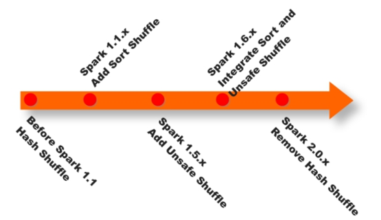 5-》到最近的2.0版本,Hash Shuffle已被删除,所有Shuffle方式全部统一到Sort Shuffle一个实现中。下图是spark shuffle实现的一个版本演进。