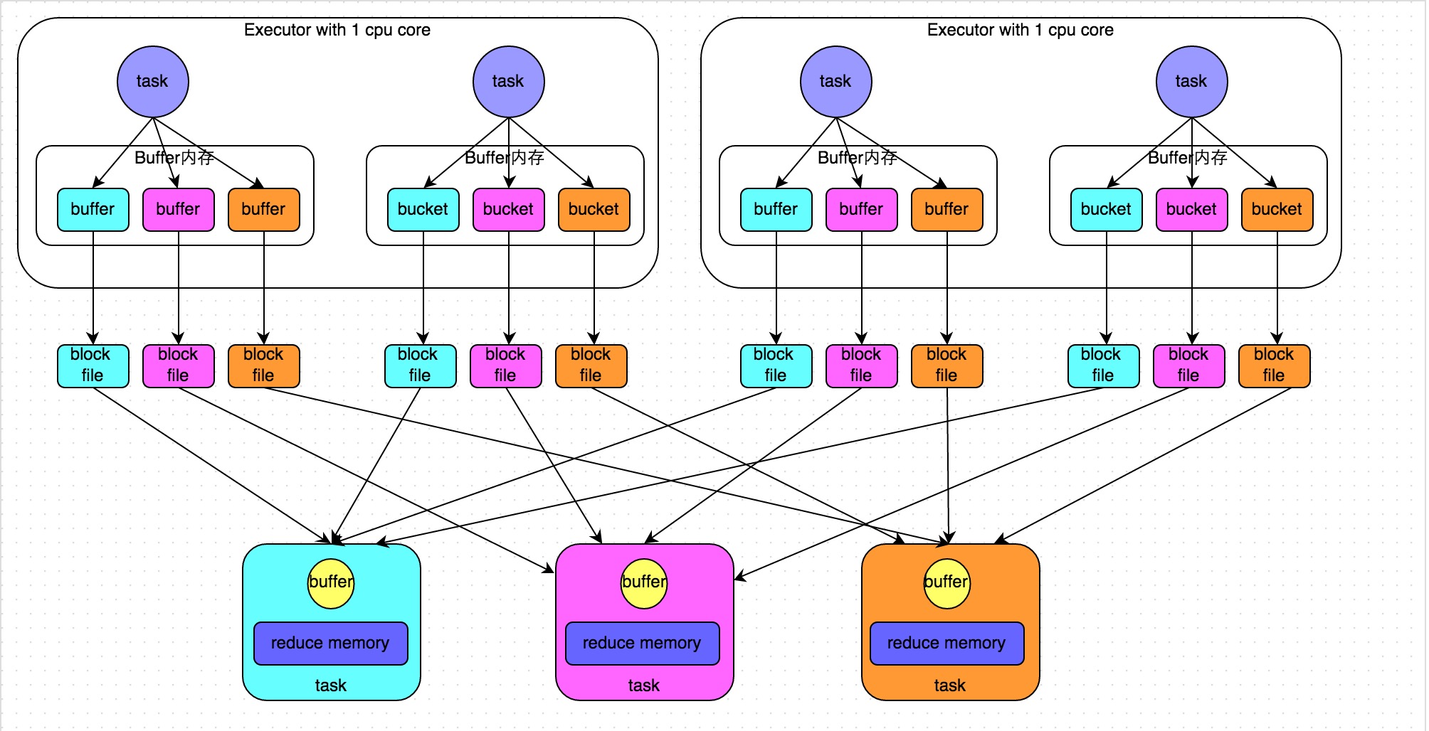 有 3 个 Reducer,从 Task 开始那边各自把自己进行 Hash 计算(分区器:hash/numreduce 取模),分类出 3 个不同的类别,每个 Task 都分成 3 种类别的数据,注意:因为每个executor只有一个core,所以executor中的两个task是先后执行的。想把不同的数据汇聚然后计算出最终的结果,所以 Reducer 会在每个 Task 中把属于自己类别的数据收集过来,汇聚成一个同类别的大集合,每 1 个 Task 输出 3 份本地文件,这里有 4 个Mapper Tasks,所以总共输出了 4 个 Tasks x 3 个分类文件 = 12 个本地小文件。