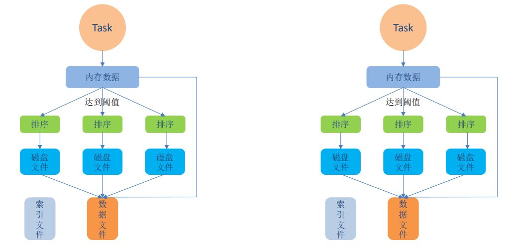 -》最后:在每个 Task 中,将所有的临时文件合并,这就是 merge 过程。此过程将所有临时文件读取出来,一次写入到最终文件。意味着一个 Task 的所有数据都在这一个文件中。同时单独写一份索引文件,标识下游各个Task的数据在文件中的索引,start offset和end offset。